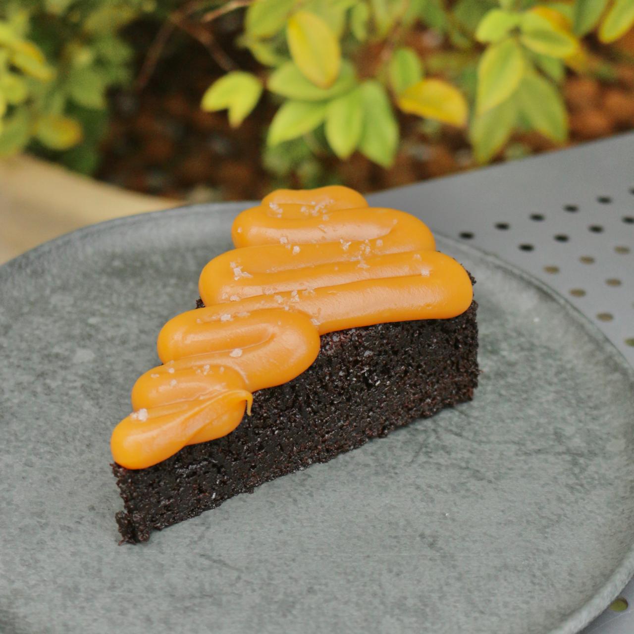 Bolo de chocolate macio e fofinho com delicioso brigadeiro de caramelo salgado, finalizado com flor de sal. Obs: peça um add de bacon por 4 reais e veja a magia acontecer!