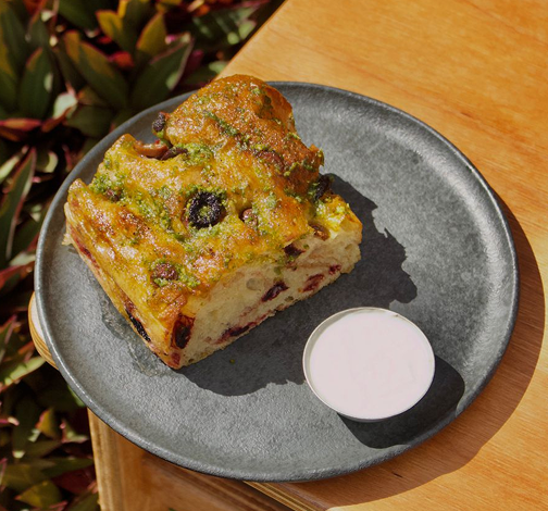 Focaccia artesanal, com azeitonas pretas. Finalizada com pesto fresco de rúcula e acompanhada de uma porção de requeijão caseiro. Tudo feito na casa